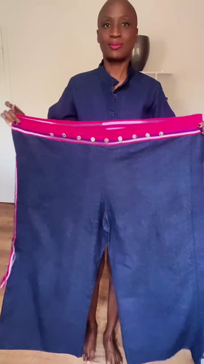 Jean couture oversize à boutons,avec poches et ceintures en pagne tissé – édition artisanale