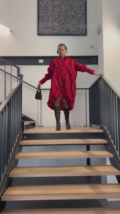 Robe chemise en wax satiné (coton texturé, toucher soyeux et lumineux)